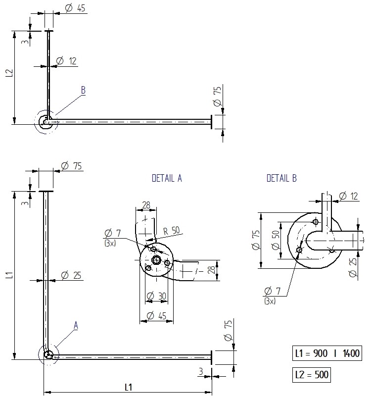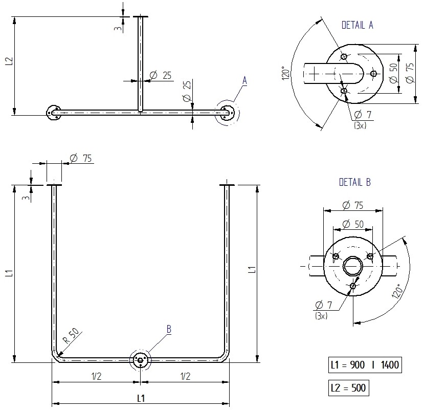 – rozmery 900 x 900 mm, 1 400 x 1 400 mm (na zákazku je možné vyrobiť aj iný rozmer), slúži na upevnenie do rohu miestnosti so stropným uchytením, L = 500 mm, s prírubami - závesová tyč v tvare U
